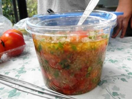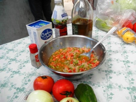 ぶどう酢たっぷりの野菜ソース「ヴィナグレッテ」をご紹介します。ブラジルではバーベキューをする際に欠かせないソースで、お肉に添えて、またパンにお肉とソースを挟んでいただきます。ブラジルの海岸には、焼きそばやイカ焼きなどの屋台はないけれど、このソースにあさりのむき身を加えたものを持ち寄り、お酒とともに楽しむんだよ~、とスマヤさんは教えてくれました。作り方は・・・。